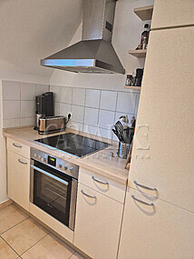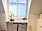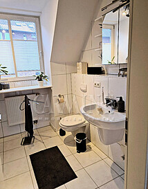 Einbauküche, helles Duschbad, teilweise Fliesen,