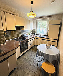 Einbauküche, Wannenbad, Fensterrahmen aus